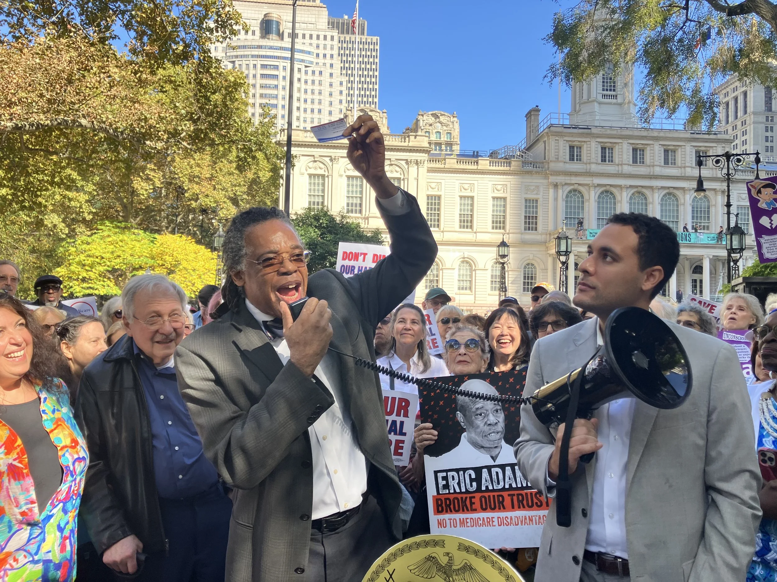 Dr. Donald Moore holds up his Traditional Medicare card during a rally in in City Hall Park last fall advocating for passage of Intro. 1096—Council Member Chris Marte’s bill to protect municipal retiree’s Traditional Medicare benefits from profit-driven Medicare Advantage plans.