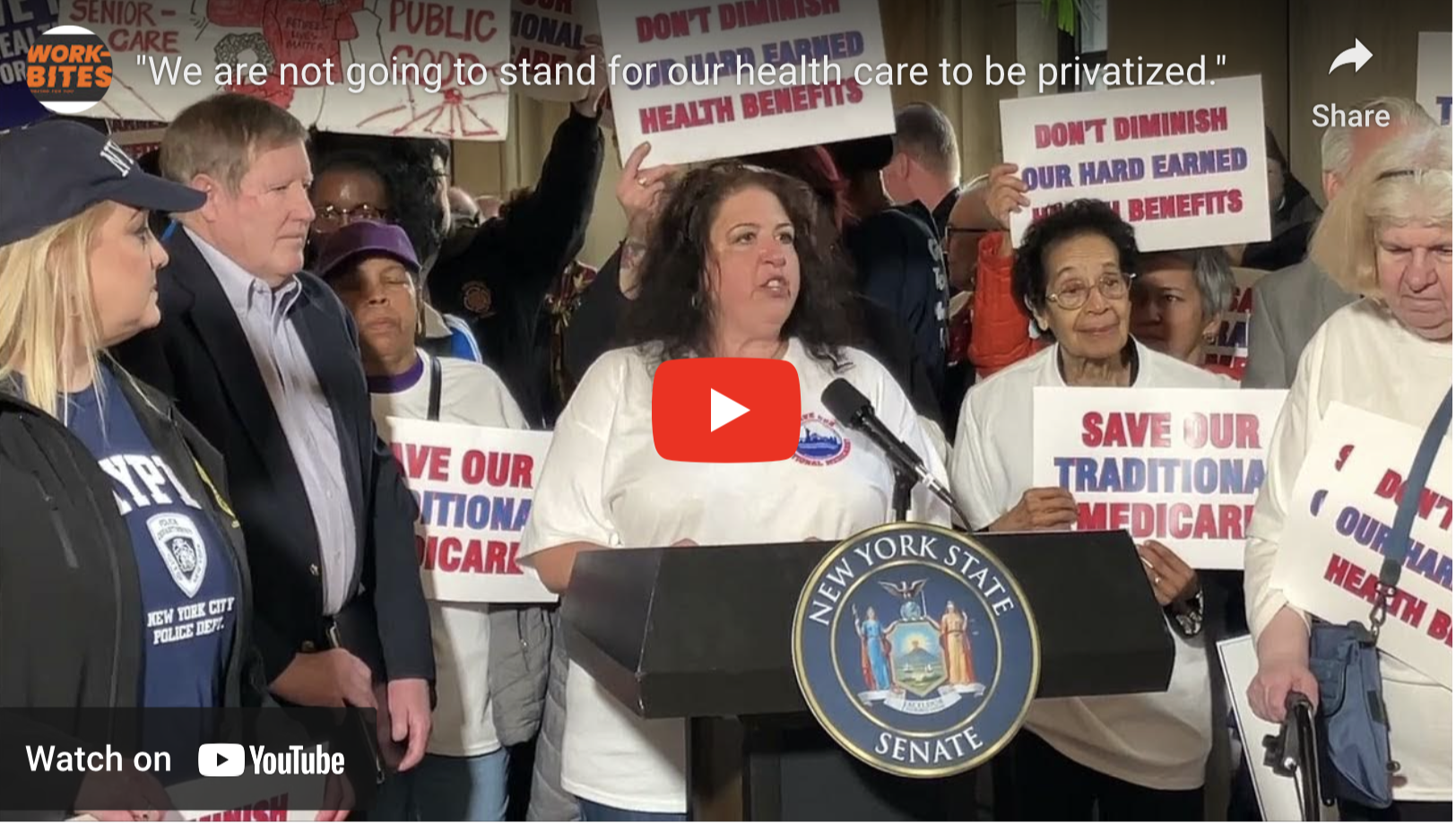 In this Work-Bites video, New York City Organization of Public Service Retirees President Marianne Pizzitola denounces the ongoing campaign to push New York municipal retirees into a profit-driven Medicare Advantage plan as “abhorrent” — and vows to put a stop to it.