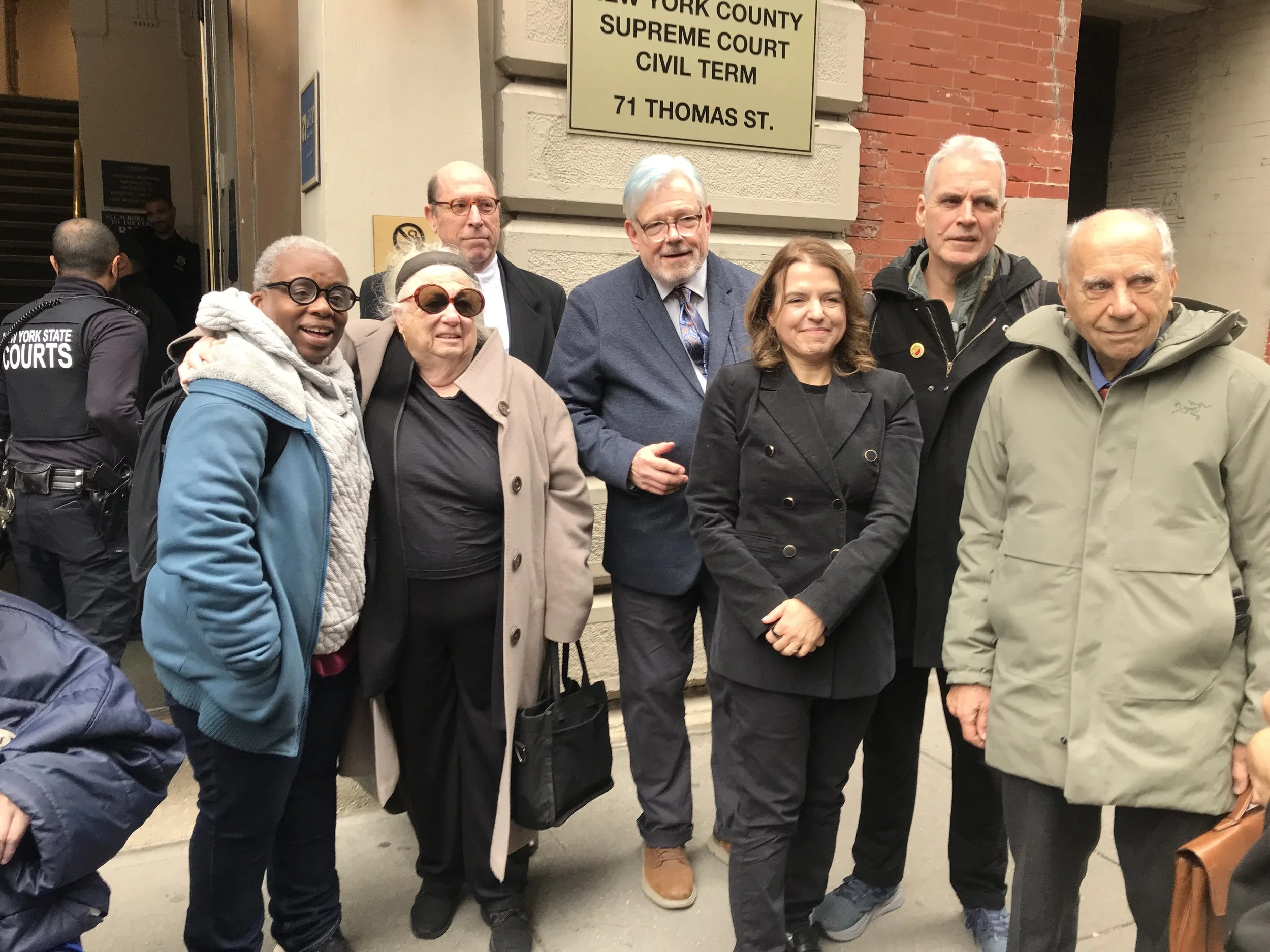 Elliott-Chelsea tenant leader Renee Keitt [left] joins Tom Duane [center], Layla Law-Gisiko, John Mudd, and John Low-Beer outside the courthouse.