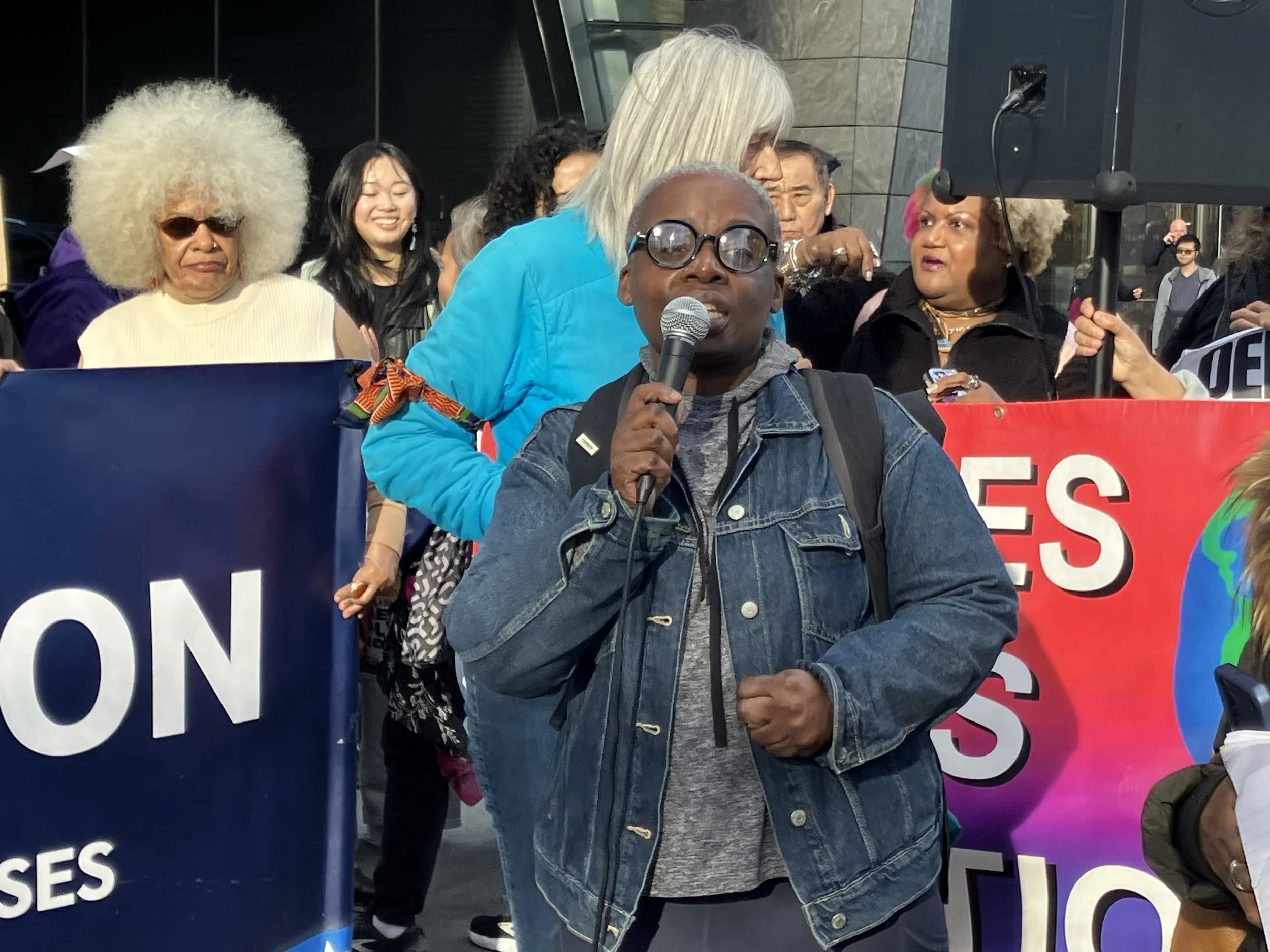 Renee Keitt, president of the Elliott-Chelsea Resident Association and FEC Tenants Against Demolition, speaks out against demolition during a Nov. 8, 2025 rally outside Related Companies headquarters in Hudson Yards.