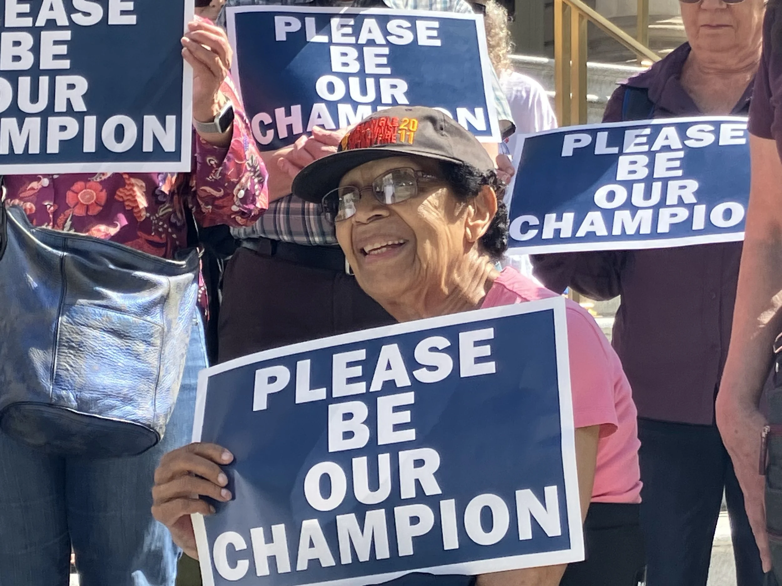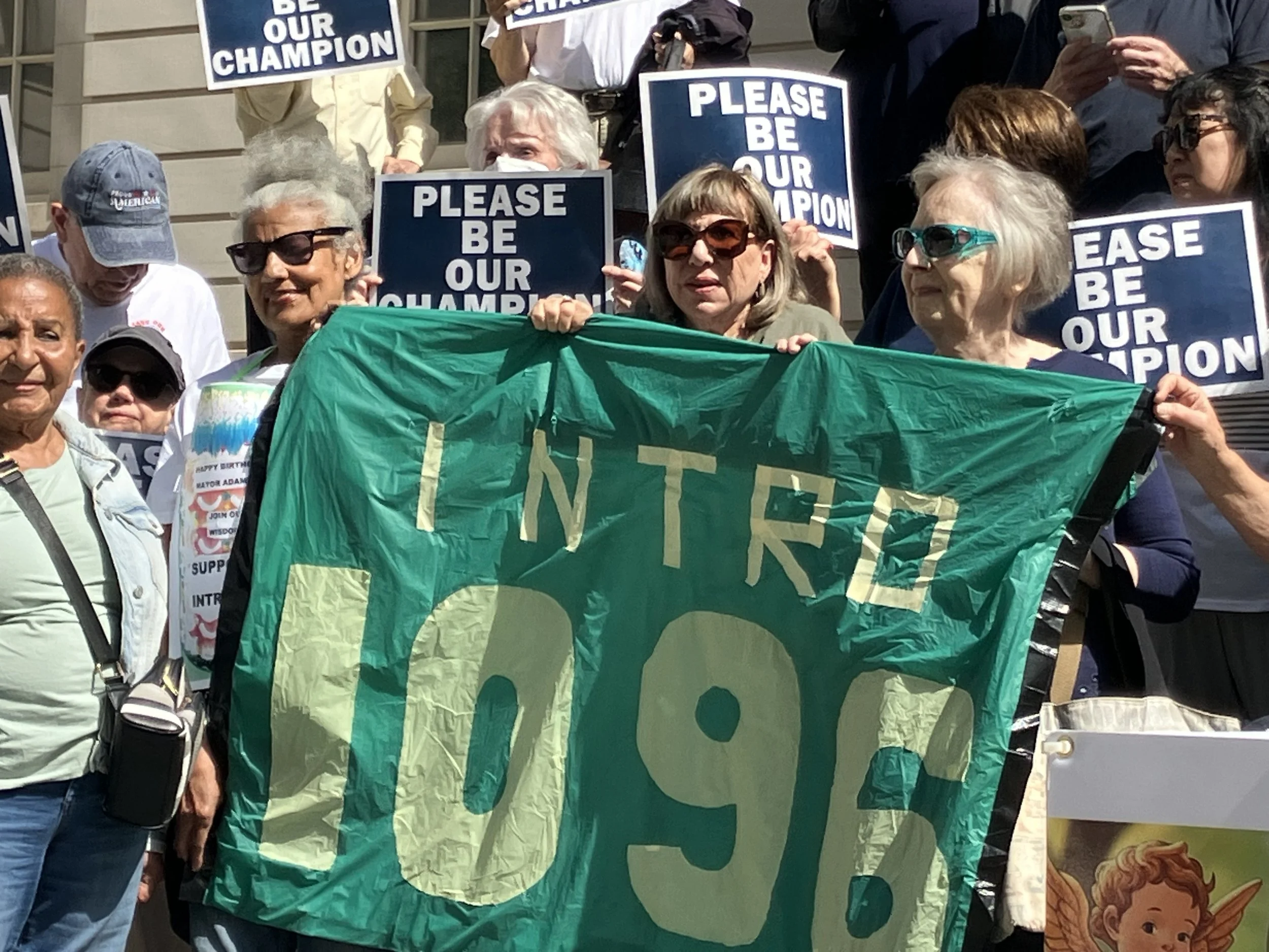 New York City retiree and cancer survivor Roberta Gonzalez (middle) helps hold up a banner for Intro. 1096.