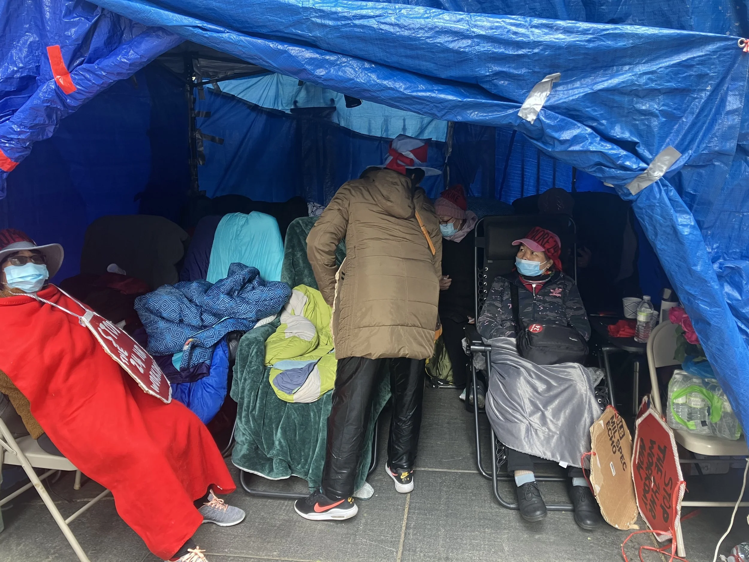 Home care workers and their advocates were forced during a Code Blue cold weather alert on April 21 to relocate this tent sheltering hunger strikers at Broadway and Murray Street.