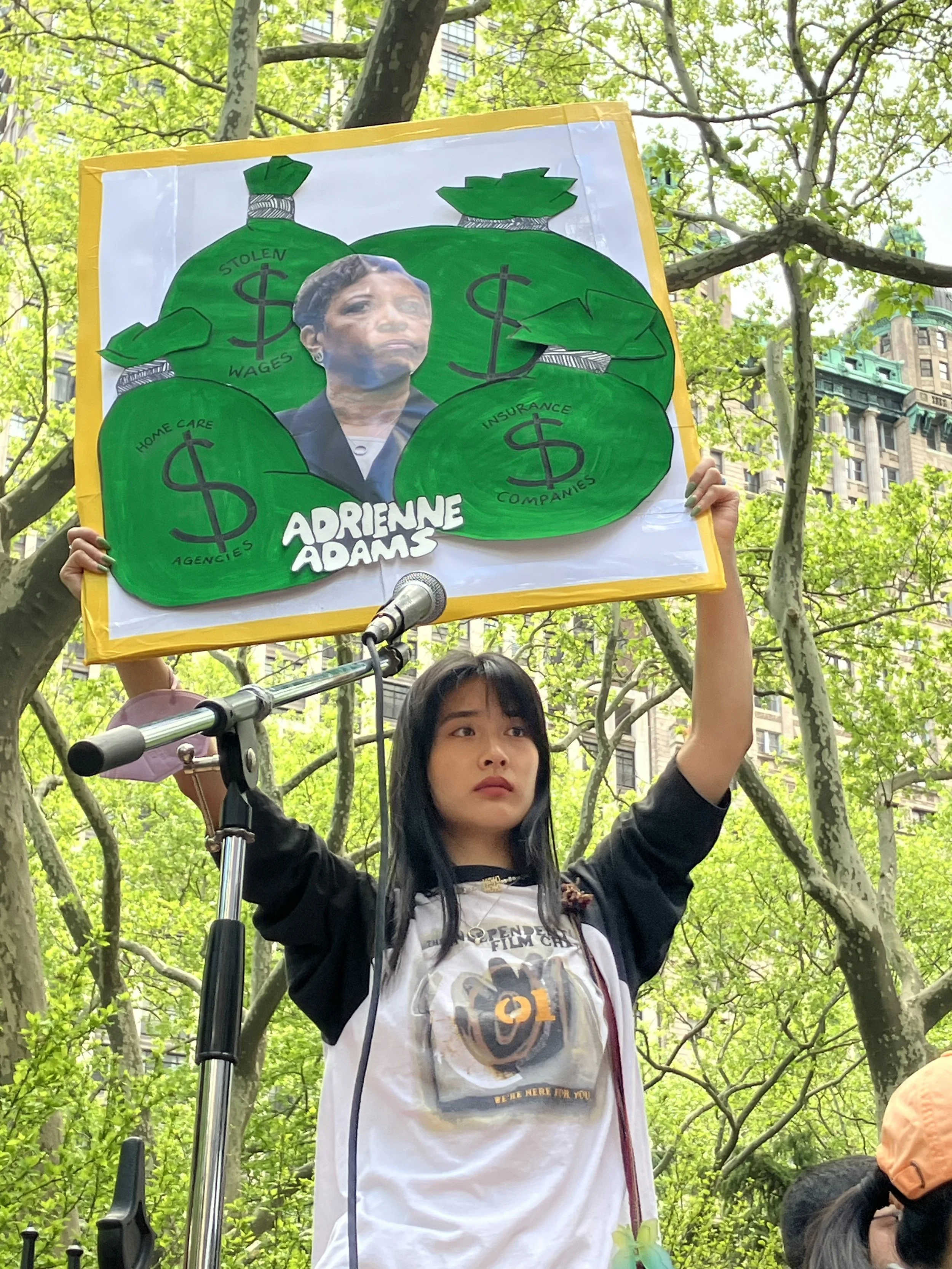 Advocates for New York City home care workers forced to work round-the-clock shifts at roughly half the pay jeer Speaker Adrienne Adams’ opposition to Council Member Chris Marte’s “No More 24” bill during a rally outside the gates of City Hall in 2023.