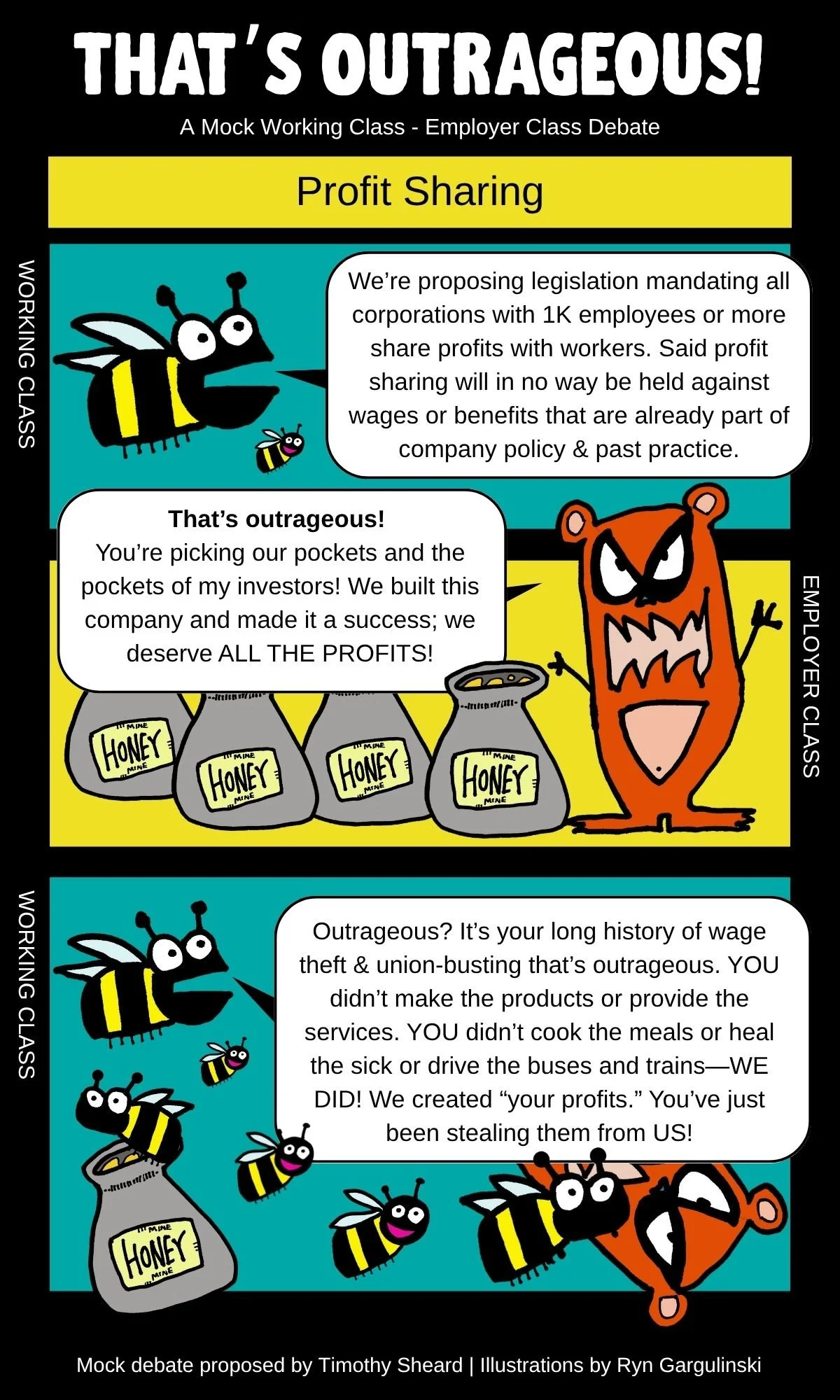 Hello Work-Bites Builders! Today we kick off a new weekly cartoon series from Work-Bites friends and contributors Tim Sheard and Ryn Gargulinski. ‘That’s Outrageous!’ imagines an ongoing mock debate portraying two very different political ideologies—one from a revolutionary working class point of view and the other from an employer/owner class POV. And while the tone is good natured and whimsical—we hope the series sparks some serious thought and discussion about the subject matter—as well as a chuckle or two. Let us know what you think. Here we go—kicking things off with “Profit Sharing.” Enjoy!