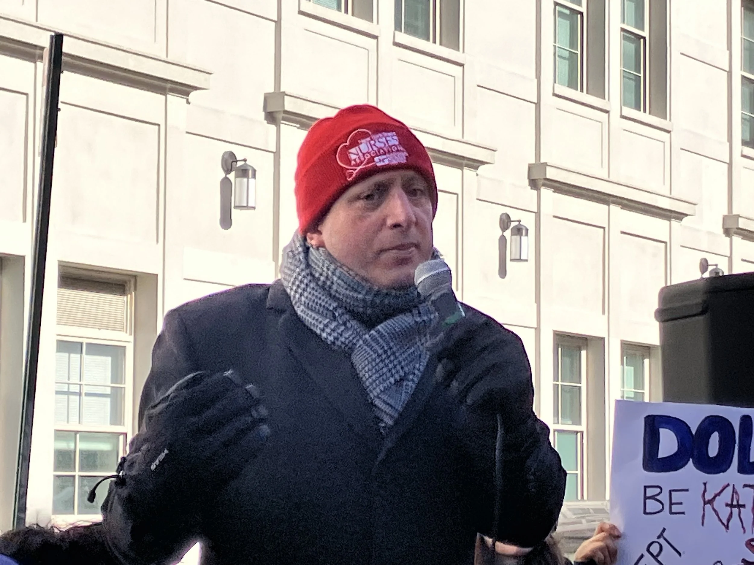 Lander spoke out at Hanson Place rally on Thursday morning wearing a red NYSNA hat in solidarity with striking New York City nurses. The former comptroller, now challenging Rep. Dan Goldman’s seat in New York’s 10th Congressional district, said that he was angry and that both ABI and Royal Care stole home care workers’ money.