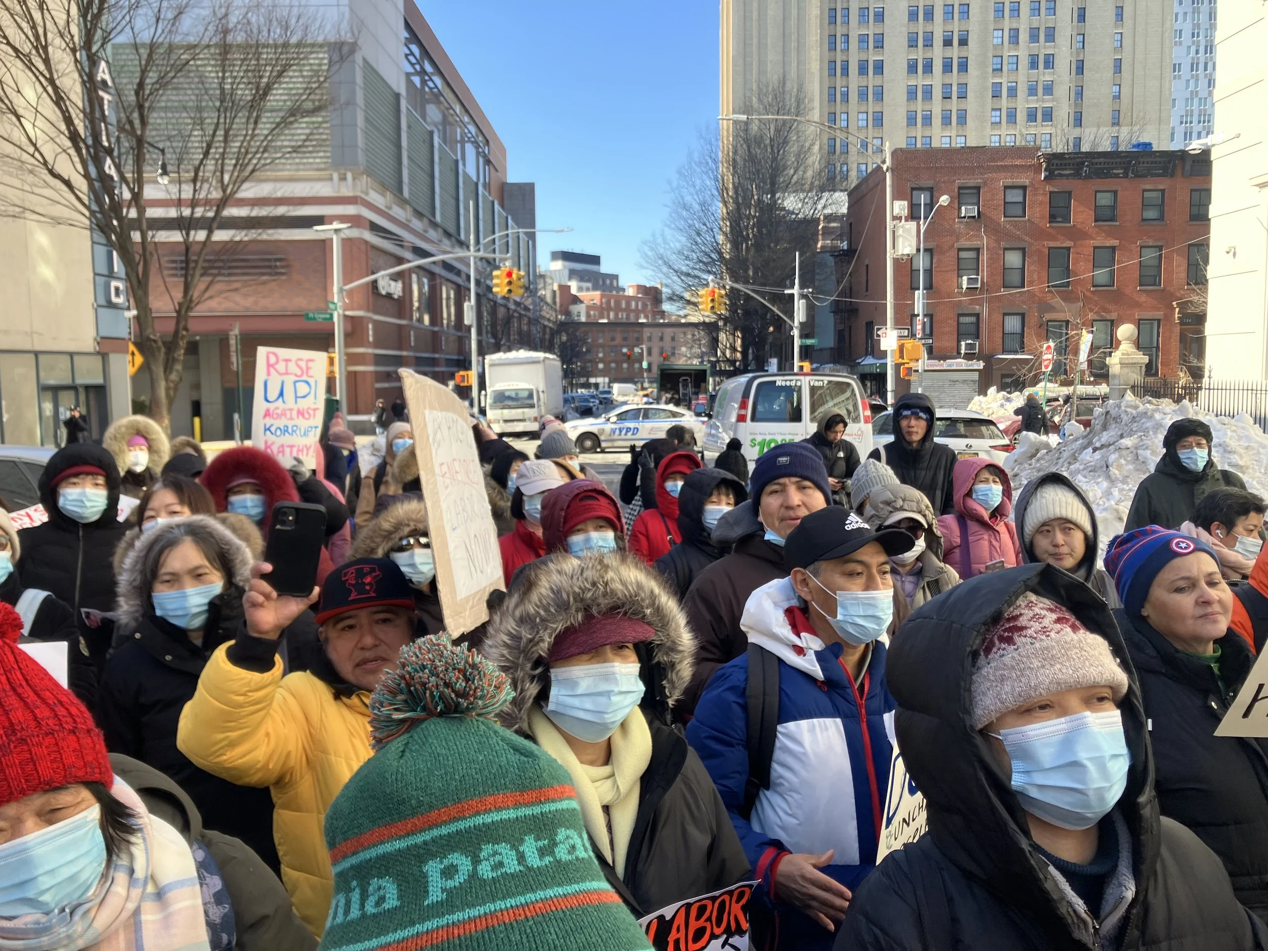 Home care workers demanding to recover more than $25 million in stolen wages flood the street outside the New York State Dept. of Labor’s offices at 55 Hanson Place in Brooklyn on Thursday.