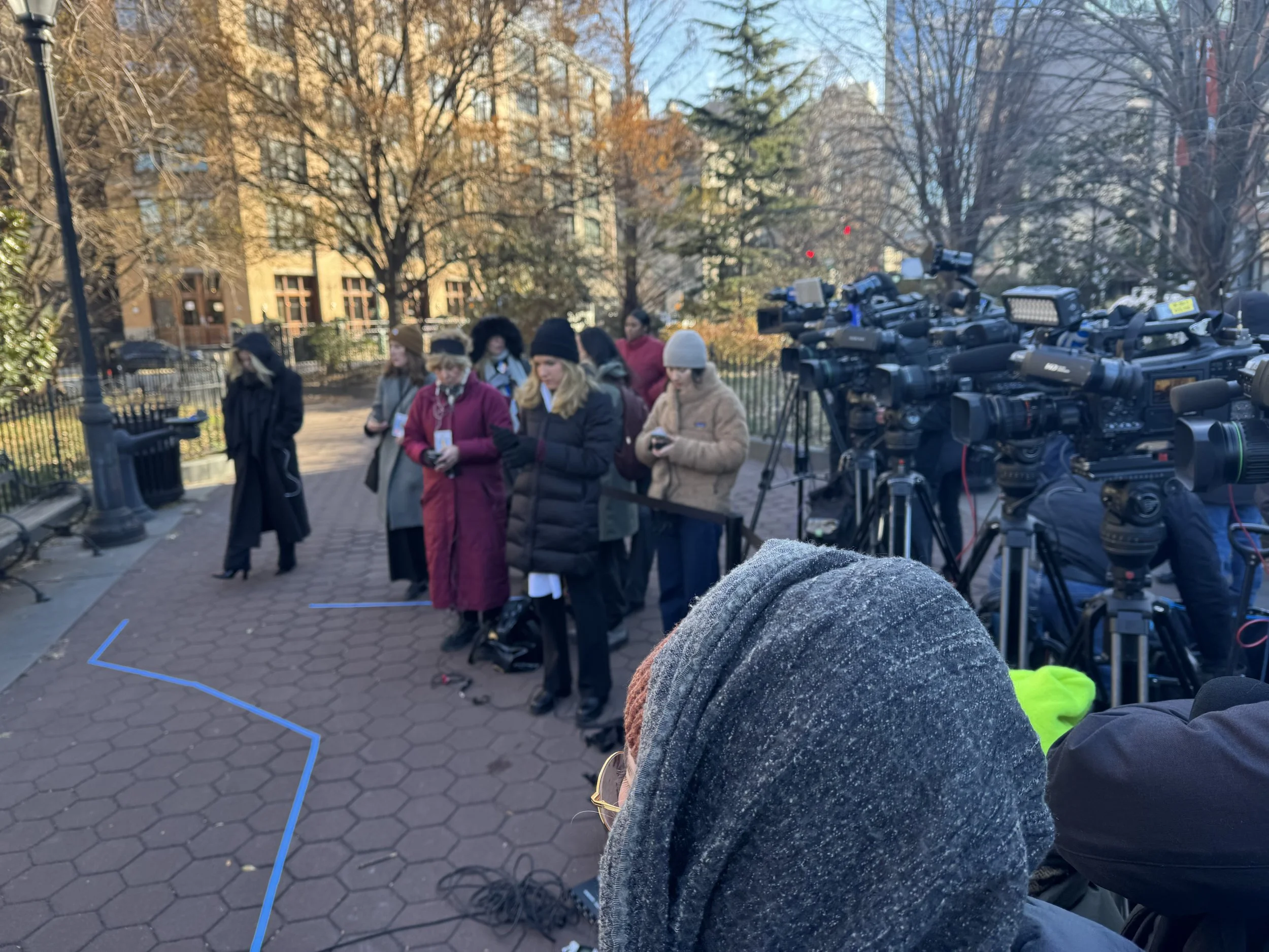 Blue tape outlines an area intended to kettle reporters hoping to ask Mayor-elect Zohran Mamdani a question during an outdoor press conference held in lower Manhattan earlier this month.