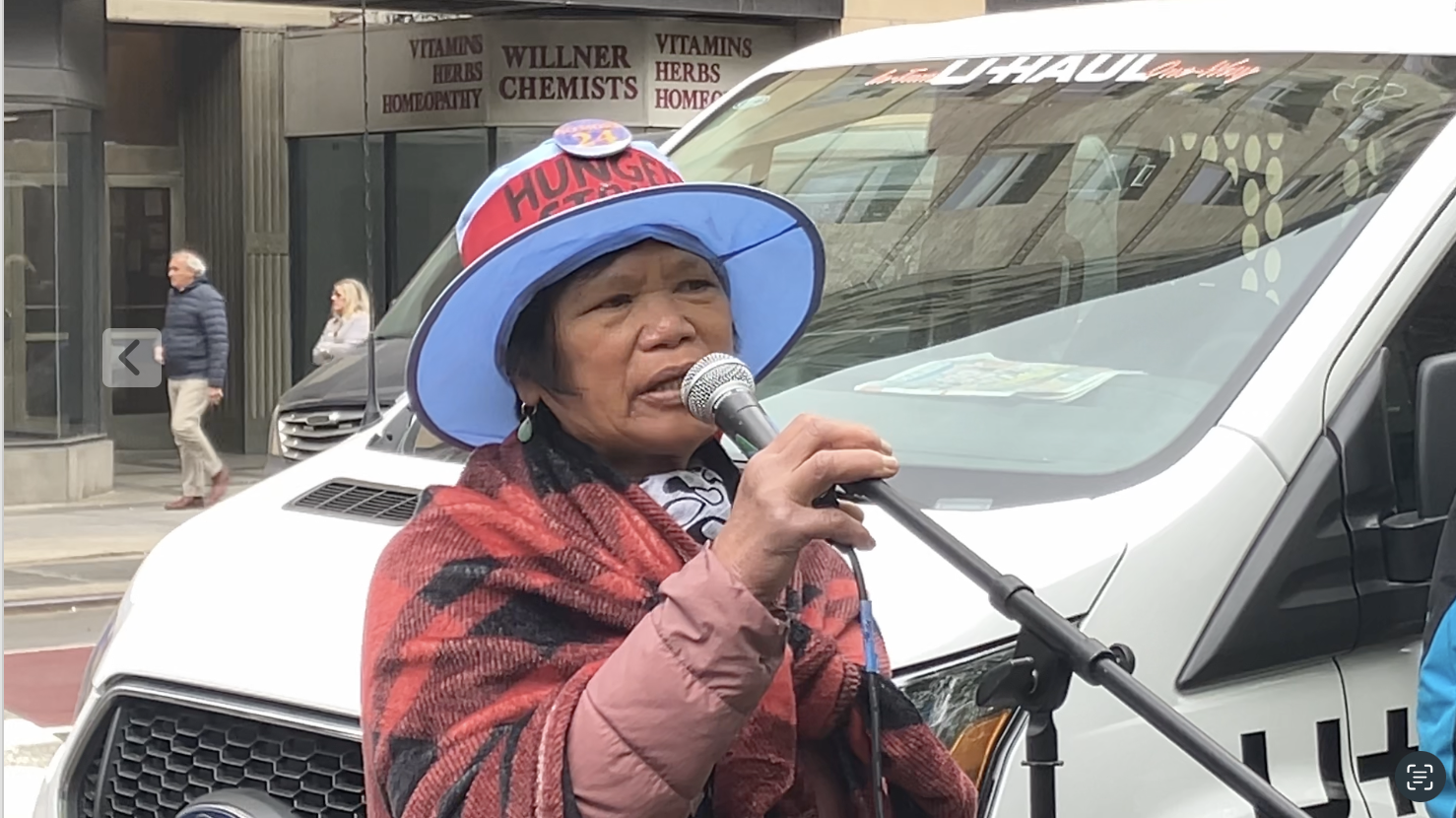 Hunger striker Cai Qiong Liu speaks out during a “People’s Hearing” for the “No More 24” bill held outside the gates of City Hall on Sunday.