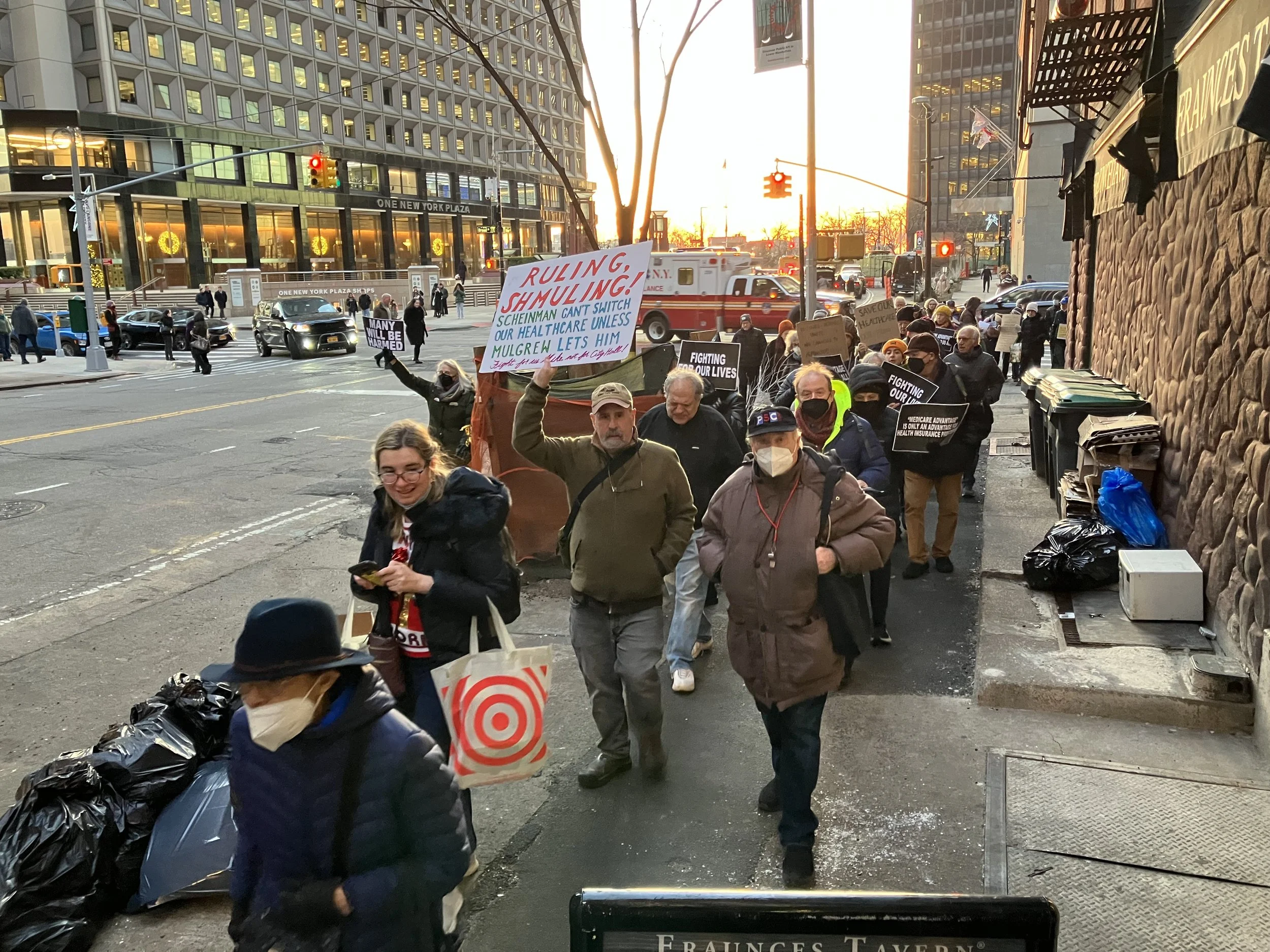 NYC municipal retirees and their supporters march pass Fraunces Tavern on the way to the MLC offices on Water Street.
