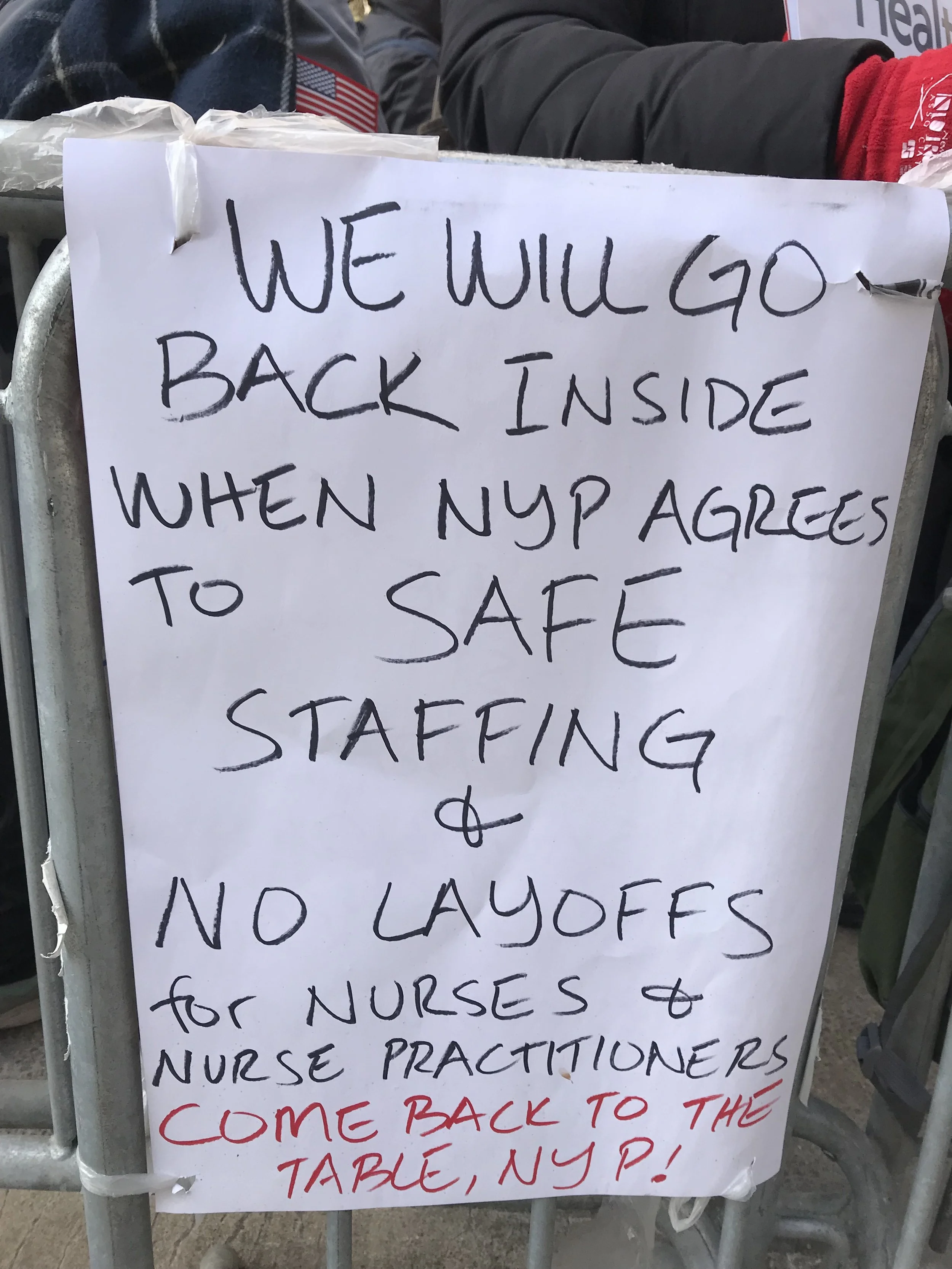 The nurses said that they also needed protections against layoffs. NewYork-Presbyterian was the only one of the three hospital chains to lay off staff last year, they said, when it axed 1,000 workers, including 46 nurses and nurse-practitioners—with only a few days’ notice, said L.S.