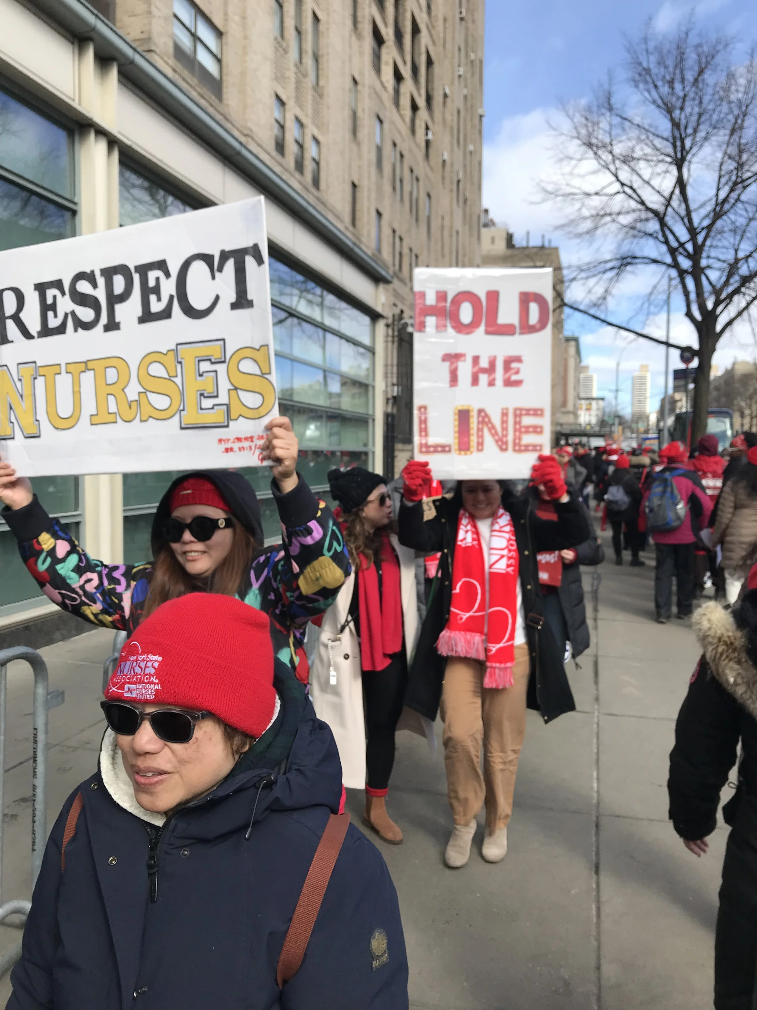 “We’re still fighting for safe staffing, which is why we were out here in the first place.”— Marielle Medina, cardiac and electrophysiology nurse. Above: Striking NewYork-Presbyterian Hospital nurses on the picket line this week. Photos/Steve Wishnia