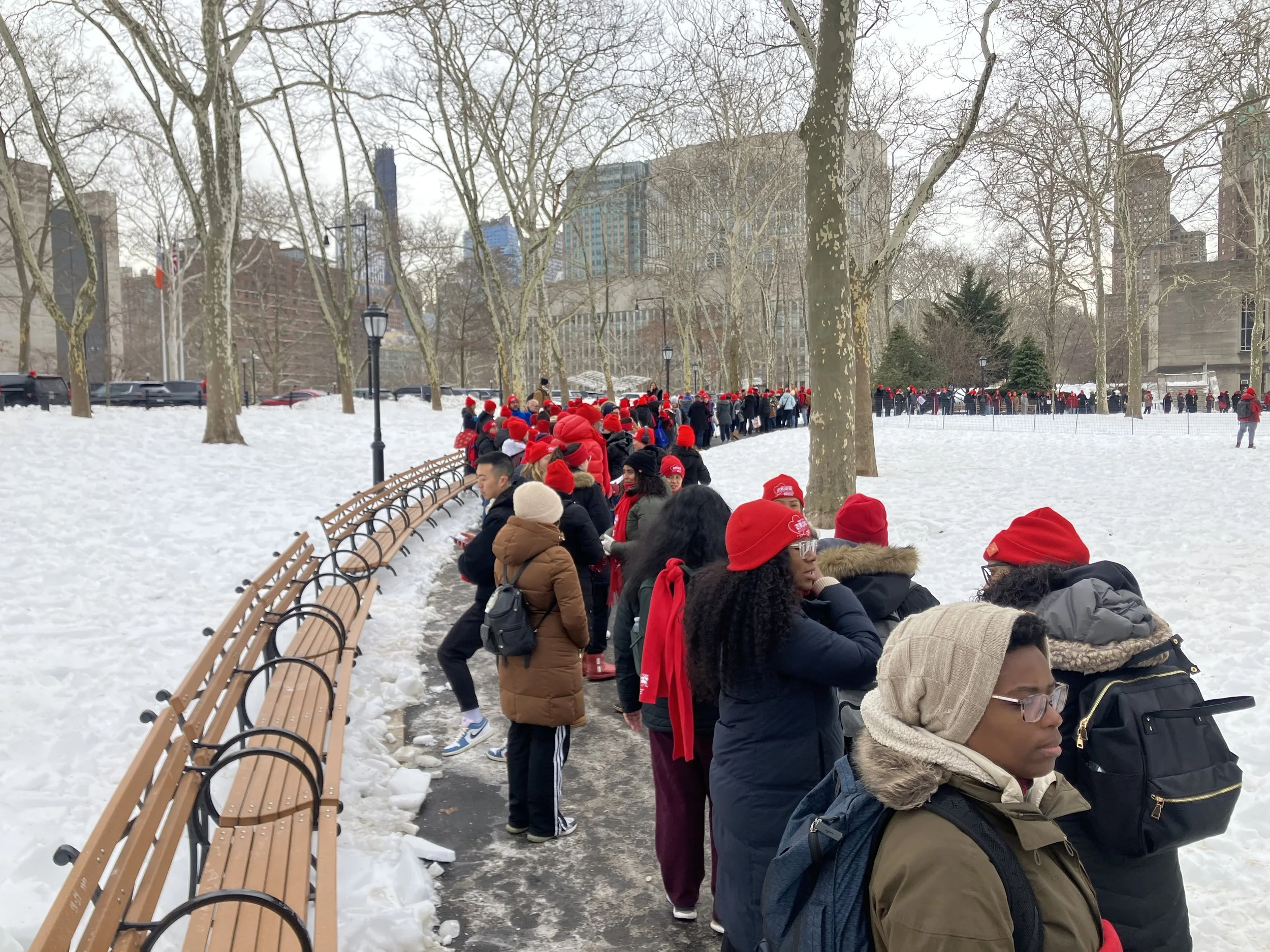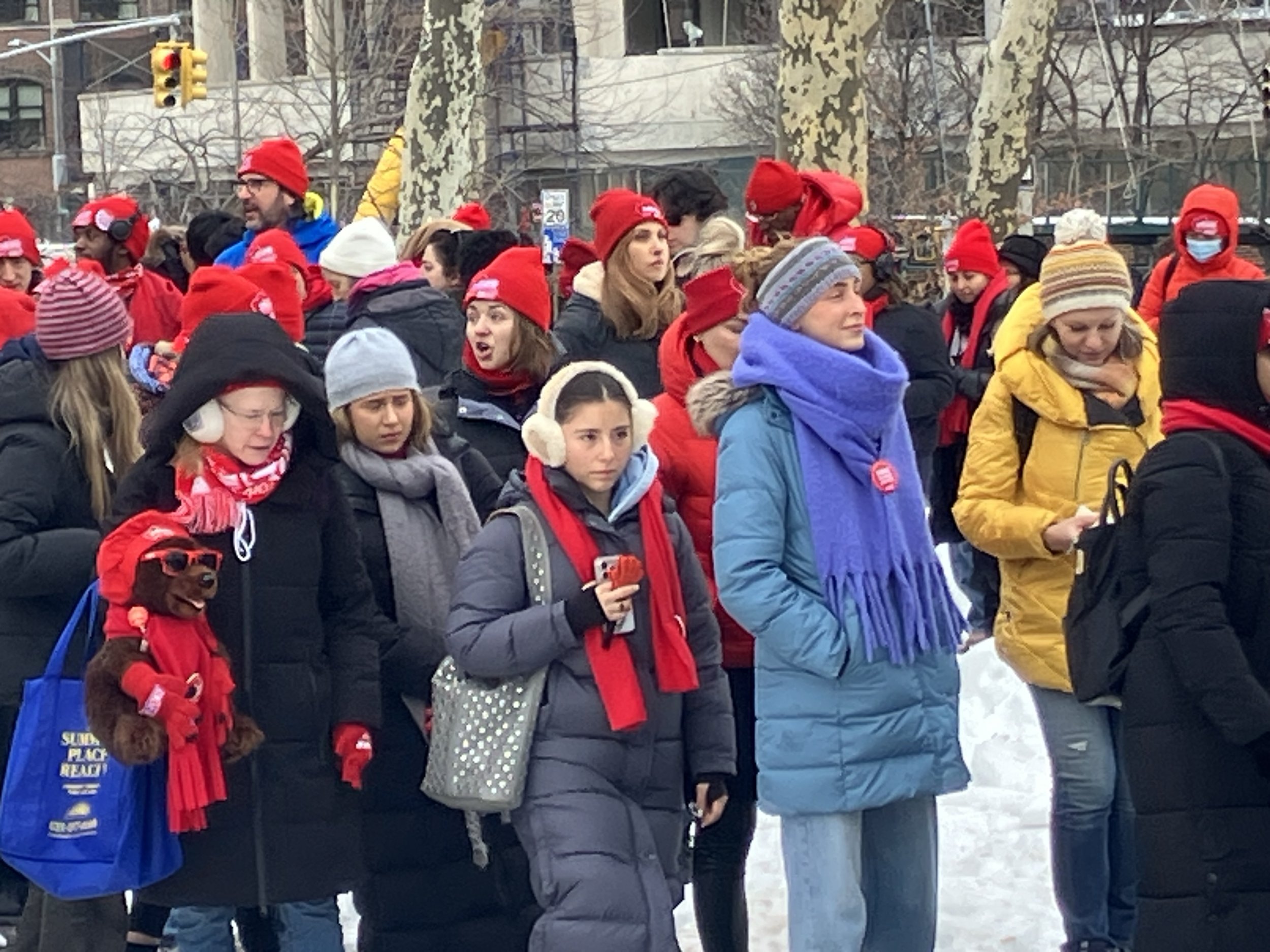 “I think the intended reaction the bosses thought we would have was one of fear and intimidation,” Montefiore Hospital nurse practitioner Roxanna Garcia told Work-Bites as the red-clad marchers arrived at Cadman Plaza Park in Brooklyn on Feb. 3. “But, honestly, our members are coming out even stronger—they are refusing to be bullied.”