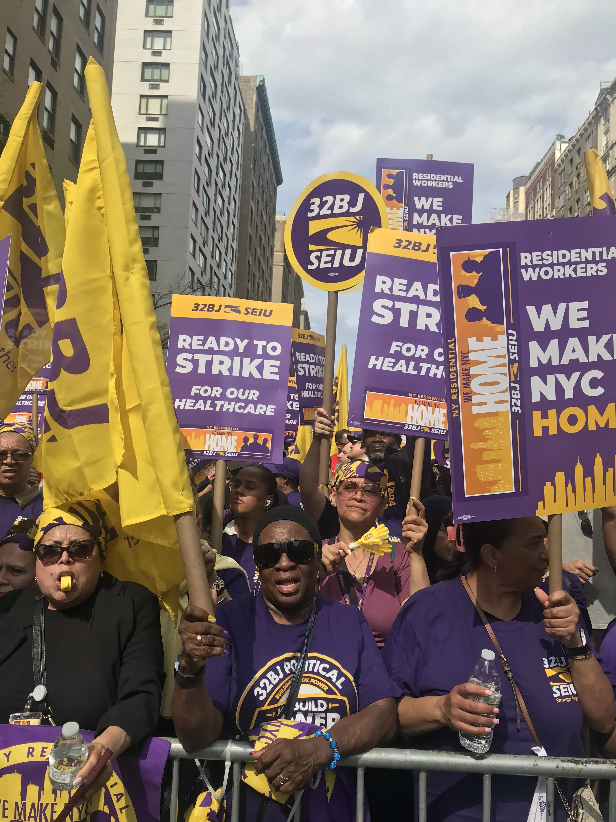 32BJ building service workers cheer vote to authorize a strike.