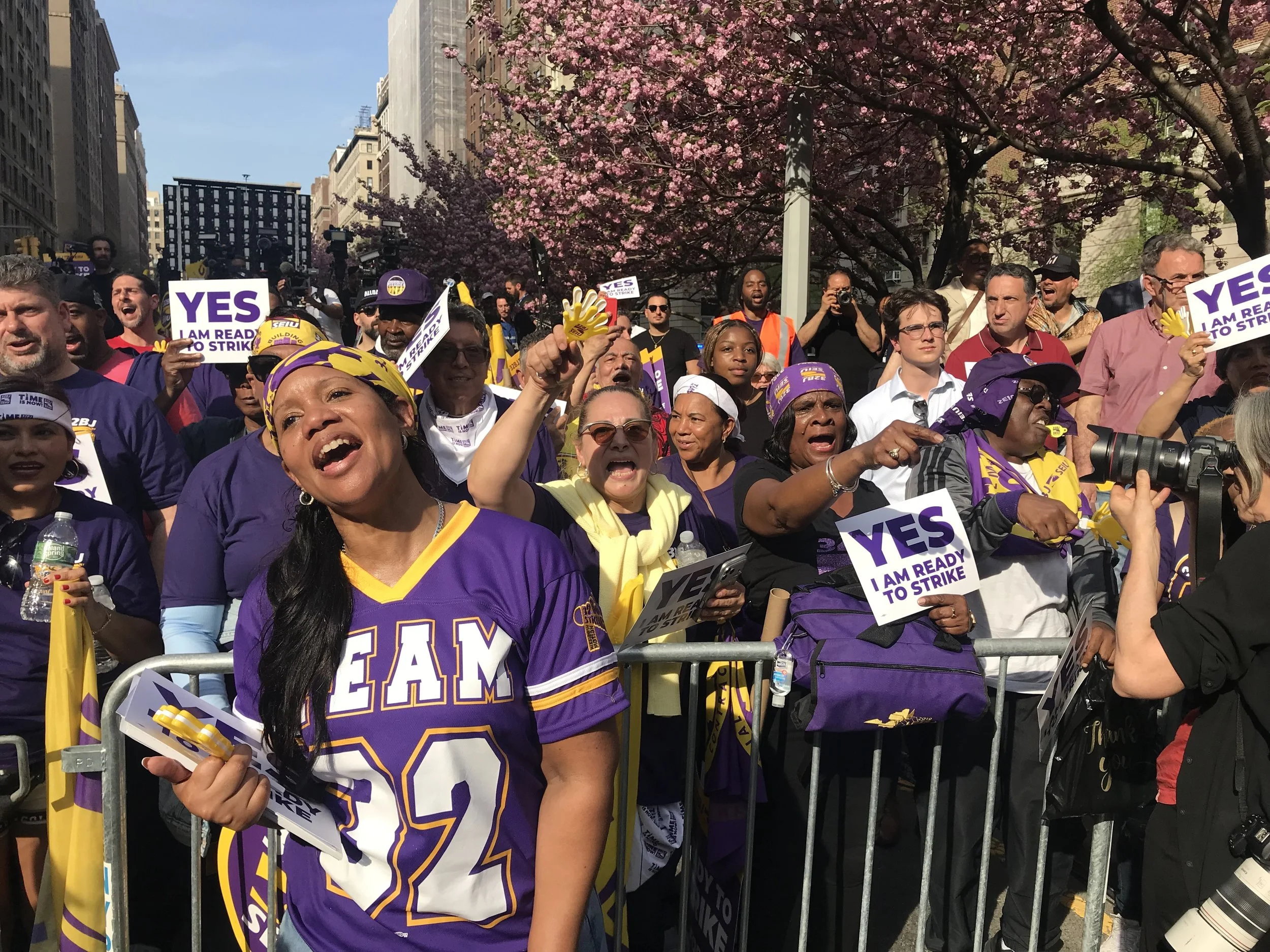 Yes, I am Ready to Strike: 32BJ building services workers took to the streets of New York City on April 15 to authorize a strike that could involve tens of thousands of people walking off the job. Photos/Steve Wishnia