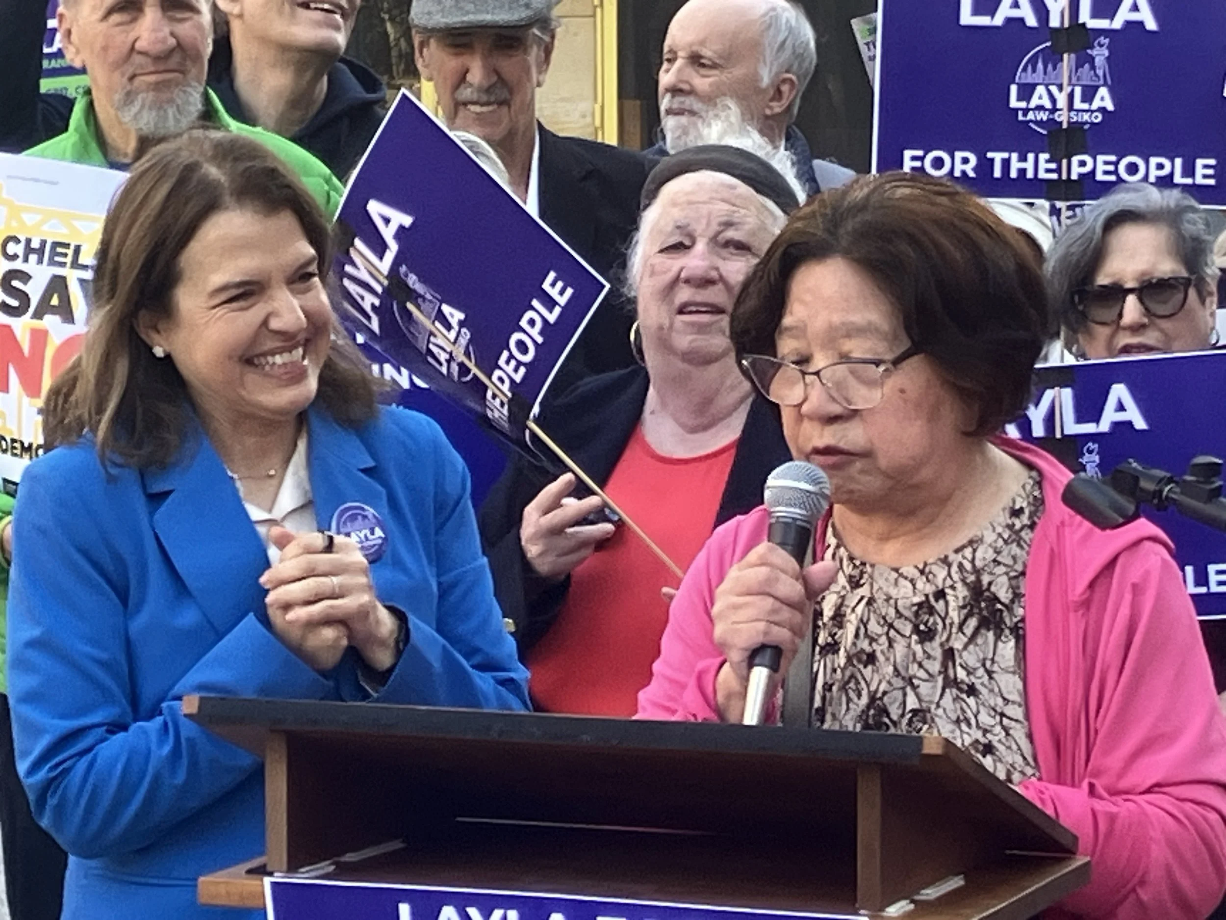 Chelsea Addition tenant Yu Story [r] , one of the stalwart Chelsea residents who are refusing to be forced out there homes, voices her support for Layla Law-Gisiko’s City Council run.