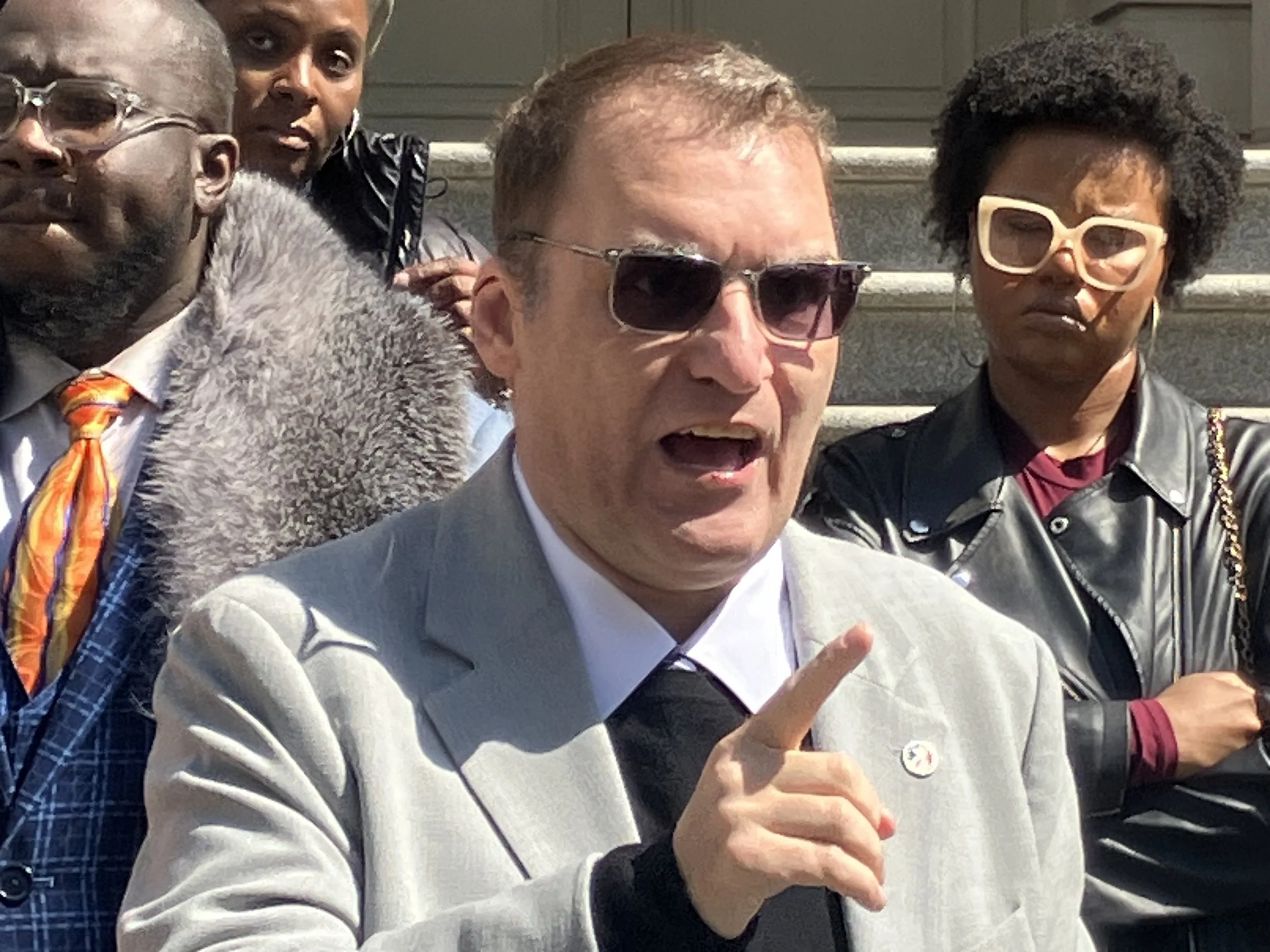 Coalition leaders critical of the Mamdani administration hold a rally in front of the City Hall steps on Friday, April 10 Photos/Joe Maniscalco