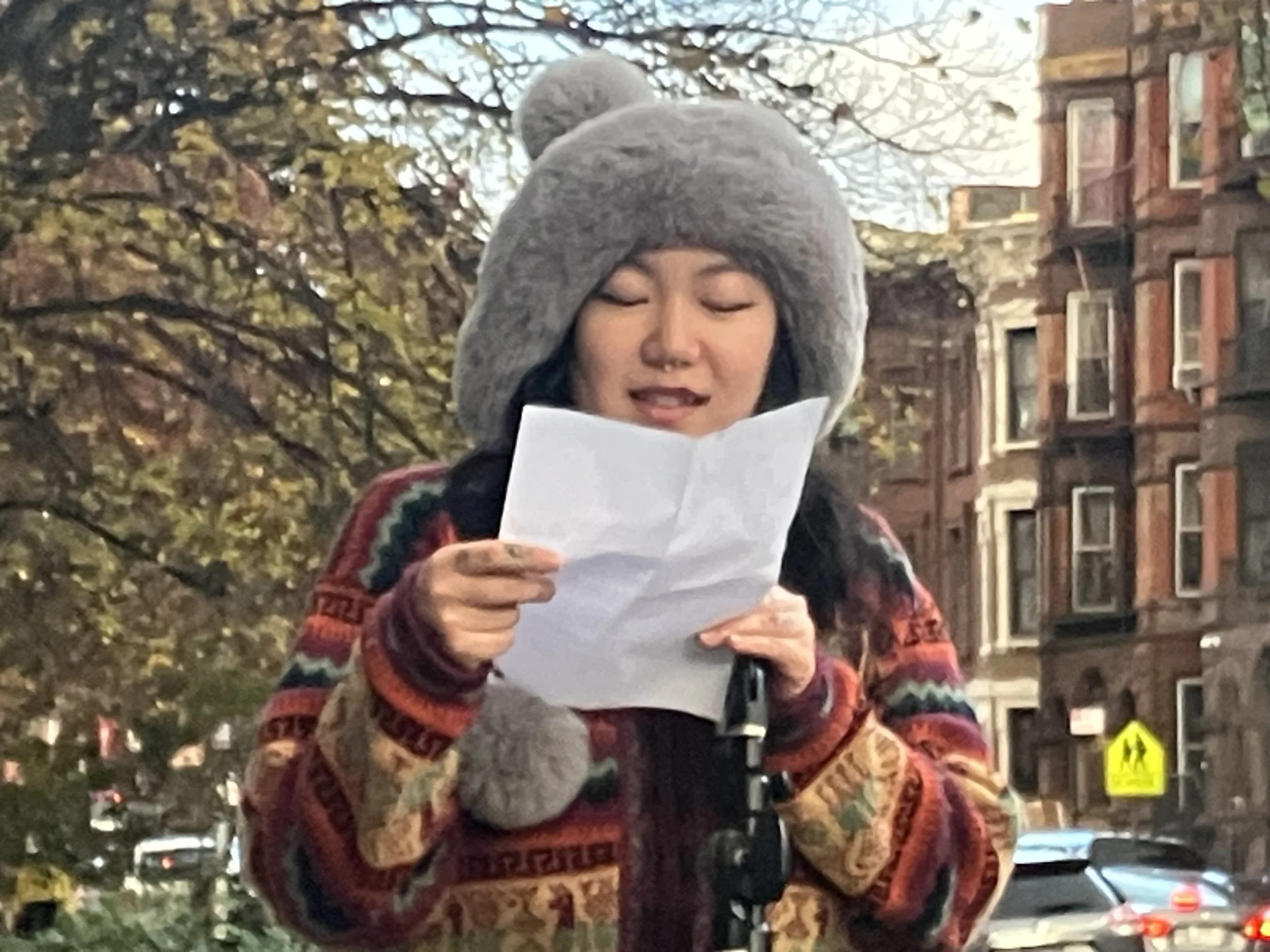 Starbucks barista Rey Saho addresses supporters outside the company’s 325 Lafayette Avenue store in Brooklyn on Nov. 13.