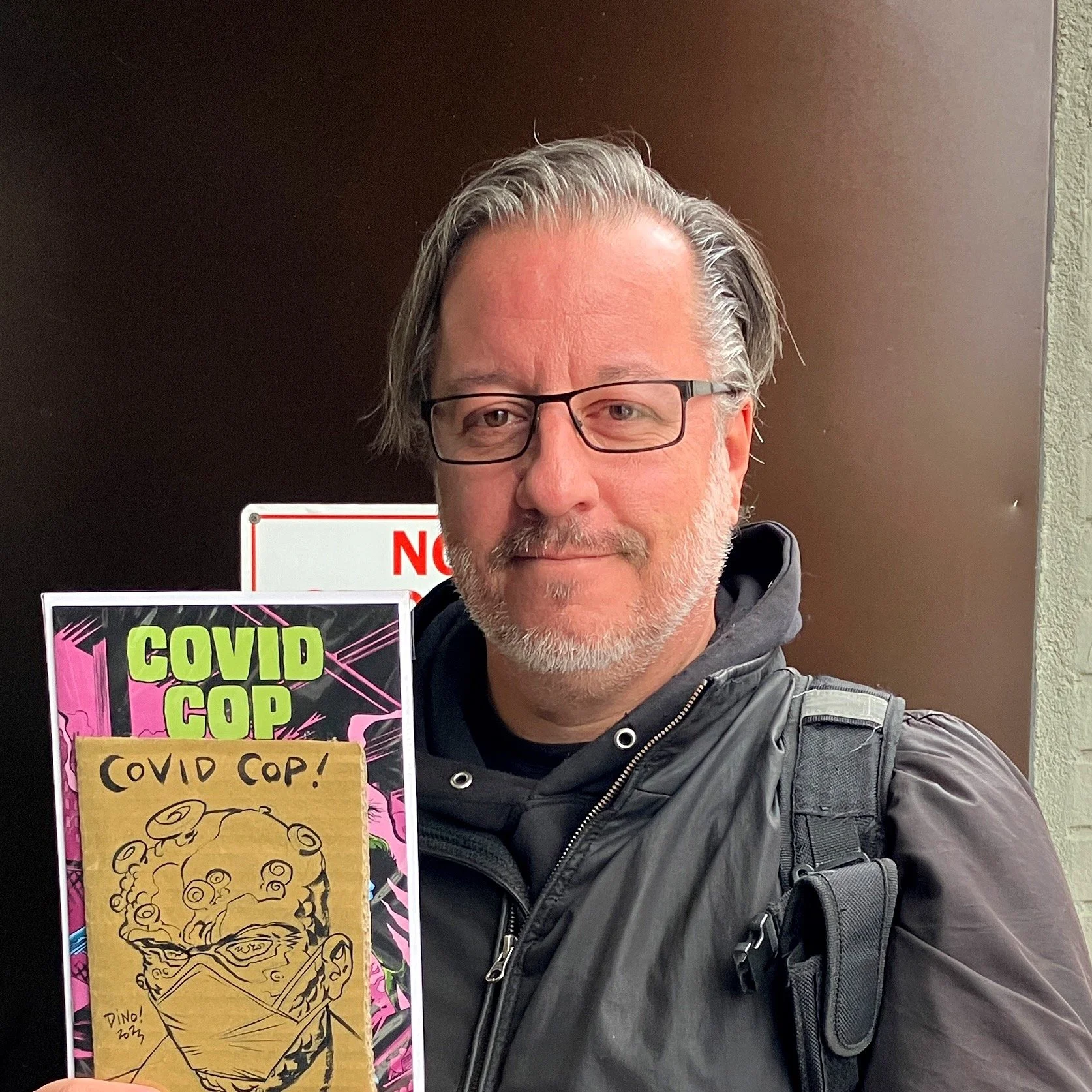 “If you read the comic, you’ll understand the fun I had with that,” he says, “trying to find the levity in horror. It is horrific what happened, the amount of people [who died], and I understand that. People cringe when they see the cover or the title “Covid Cop” because those are two words that a lot of people hate — Covid and Cop, right?”