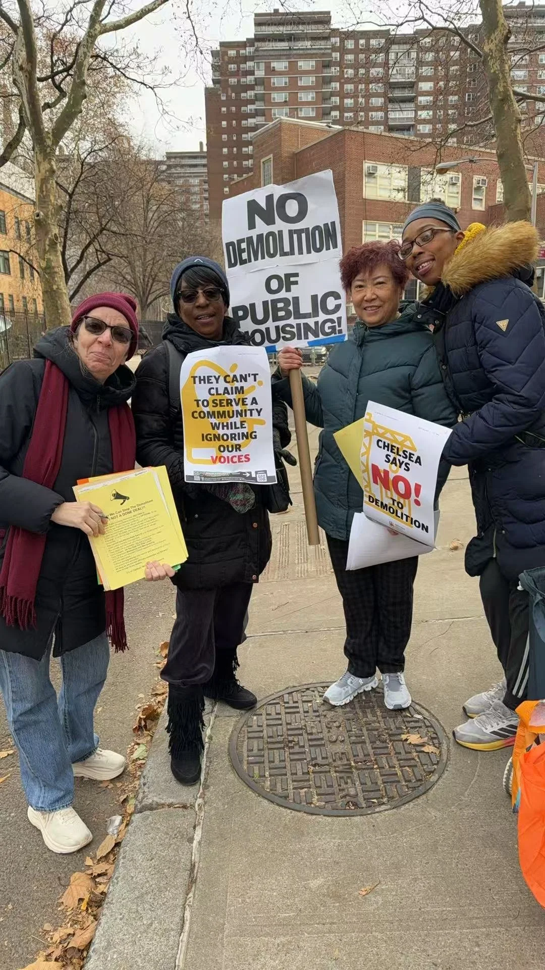 NO DEMOLITION: FEC tenants are holding informational pickets on the west side campuses to let their public housing neighbors know that—despite what NYCHA claims—they do not have to sign relocation papers and leave their homes.
