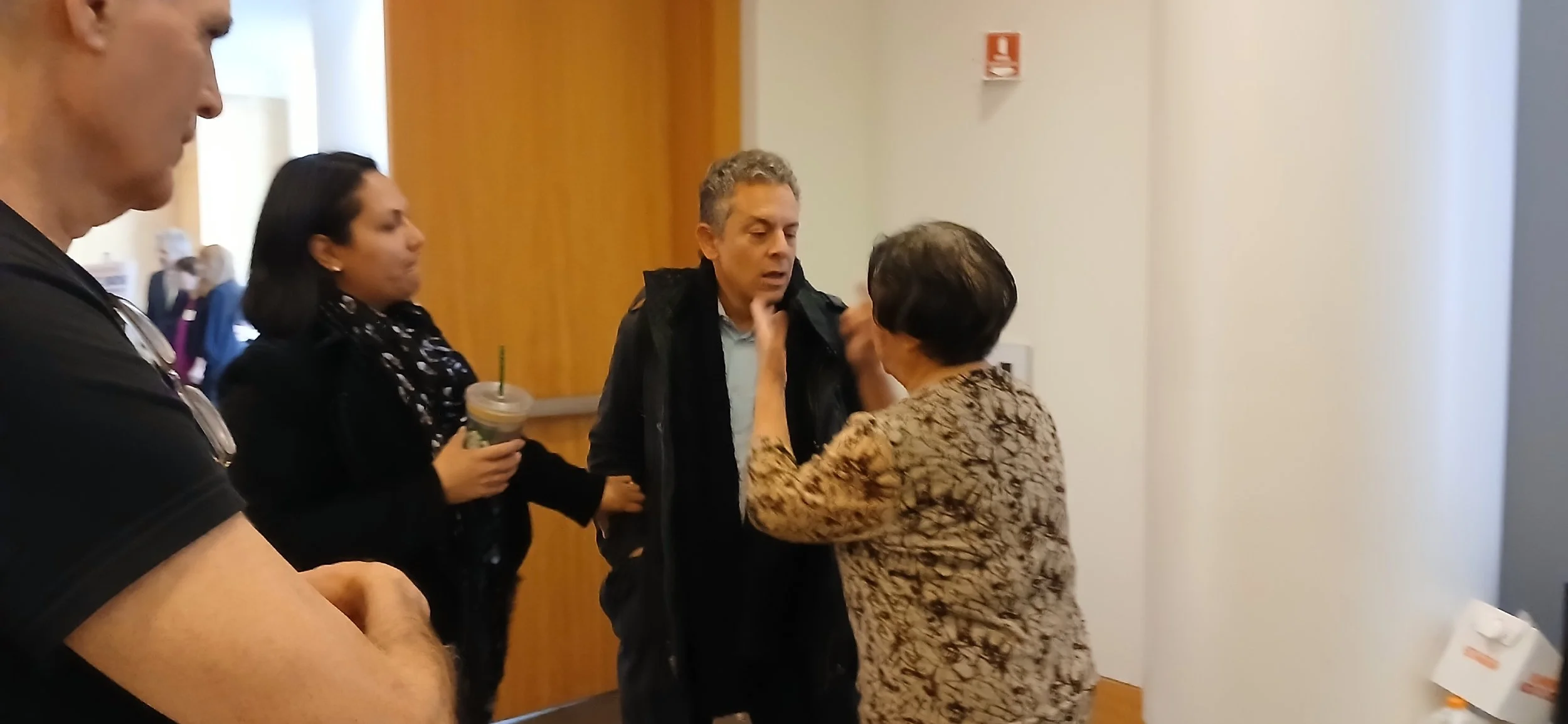 Midtown South Community Council President John Mudd looks on as Chelsea Addition tenant Yu Story [r], 80, attempts to engage with NYS Assembly Member Tony Simone [l] at last weekend’s 20th Annual West Side Tenants Conference.