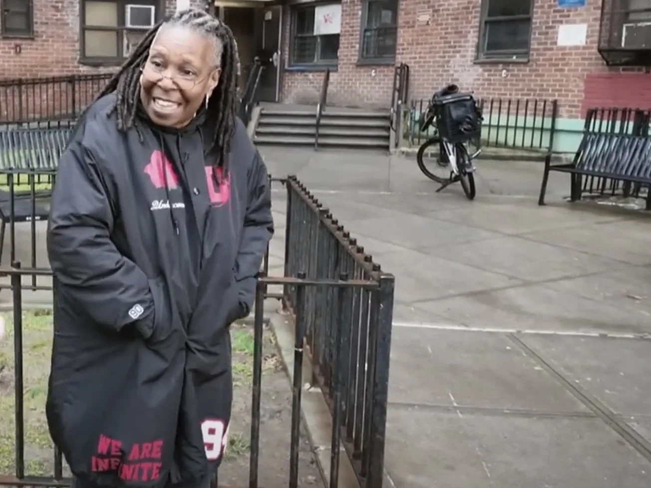 Whoopie Goldberg outside the Elliott-Chelsea Houses in 2024. The comedy legend grew up in the NYCHA public housing development now slated to be demolished and replaced with a new complex of mostly market rate luxury housing.